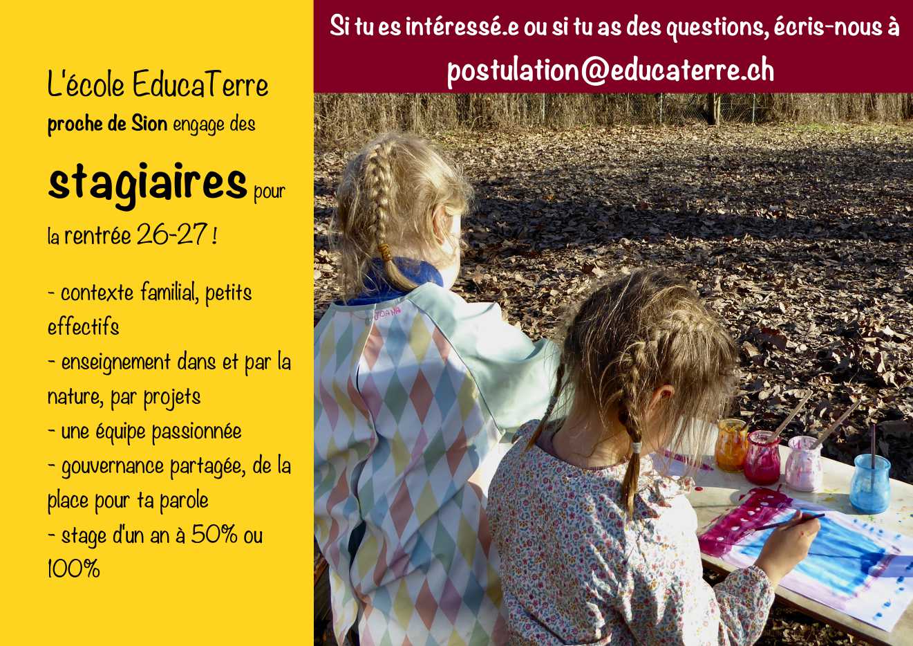 S’il vous intéresse, merci de contacter directement Isaline ou Chloé ou écrire à association@valaiscentral.educaterre.ch
